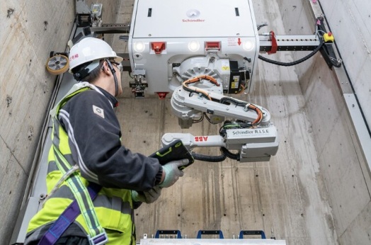 This contractor is using Schindler R.I.S.E, which is a self-climbing robot designed to navigate elevator shafts independently while installing components with precision and speed.